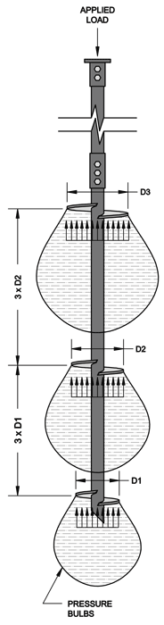 Helical piles are designed such that most of the axial capacity of the pile is generated through bearing of the helix blades against the soil. The helix blades are typically spaced three diameters apart along the pile shaft to prevent one blade from contributing significant stress to the bearing soil of the adjacent blade. Significant stress influence is limited to a 'bulb' of soil within about two helix diameters from the bearing surface in the axial direction and one helix diameter from the center of the pile shaft in the lateral direction. Each helix blade therefore acts independently in bearing along the pile shaft.