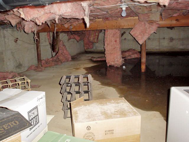 Wet fiberglass batts hanging from the floor joists is a common crawl space problem