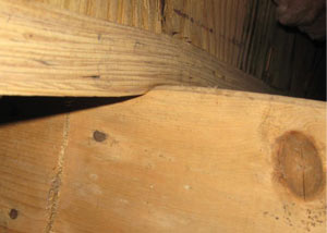 A floor joist shows signs of compression due to the weight of the home -- and too few support posts.