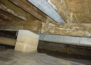 A moldy, unsupported girder (right) sinks under the weight of a home -- due to an improperly installed crawl space support.