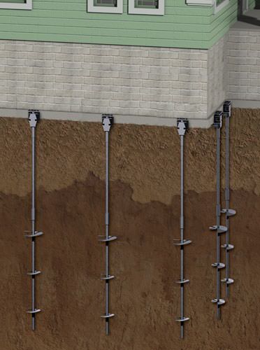 Like push piers, helical piers are attached to the foundation by mounting a bracket. Helical piers include rotating blades that are advanced (or "screwed") into the soil.