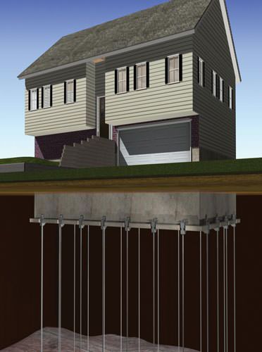 During installation, a small hole is cored through the concrete floor. A slab bracket is assembled beneath the concrete slab, and steel tubes are hydraulically driven down through this bracket assembly.