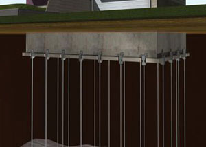 During the installation, a section of the footing is exposed and cut for each bracket. Next, round-shaft helical piers are mechanically advanced into the soil. Once the helical pier has been advanced into the soil, a foundation bracket is secured to the footing.