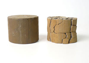 These two clay samples started out exactly the same in size, weight, and composition. The sample on the right was allowed to dry out, while the one on the left we kept moist.