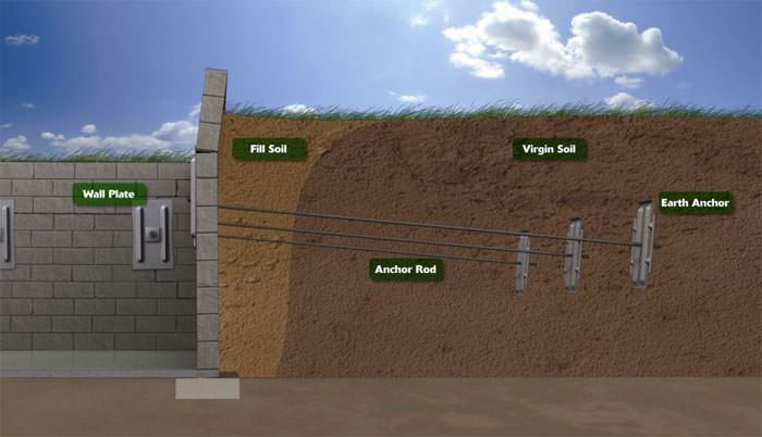 Soil anchors are placed in the ground outside the home. Steel rods attached to soil anchors extend through the foundation wall and wall plates. Wall plates distribute clamping pressure. Tightening nuts on the threaded ends of the rods stabilizes the wall for a permanent solution.