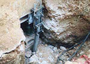 To install a push pier system, soil is first removed to expose the foundation footing where the pier will be driven. A heavy-duty steel bracket is then installed below the footing.