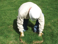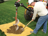 At each earth anchor location, a section of sod is carefully removed and placed aside to be returned later. Then a plastic sheet is laid down, and the hole is made with a power auger.